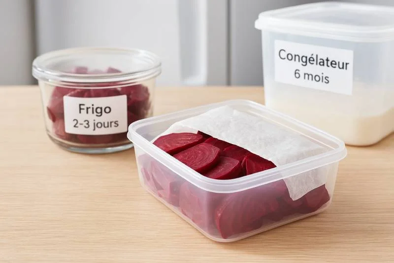 Betterave découpées se conservent dans contenants hermétiquement fermés. Enveloppez avec papiers absorbants humides si souhaités.