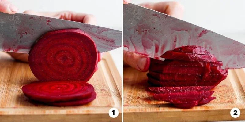 Nombreuses façons existent pour découper betterave, mais ci-dessous je partage trois coupes les plus populaire : tranches, quartier et julienne. Tranches conviennent parfaitement pour rôtissages ou ébullitions tandis que juliennes excellents pour dégustations crues en salade.
