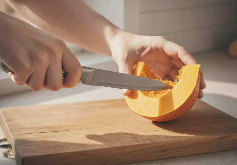 Le potiron sortant du micro-ondes libère énormément de vapeur brûlante lors de la première coupe. Éloignez votre visage et utilisez un torchon pour maintenir le légume stable. Les brûlures par vapeur sont redoutablement douloureuses.