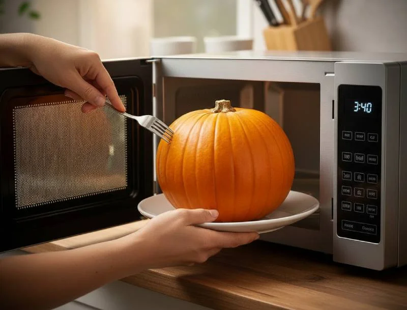 Piquez le potiron entier 8-10 fois avec une fourchette pour permettre à la vapeur de s'échapper – étape cruciale pour éviter toute explosion. Placez-le sur une assiette micro-ondable et chauffez 3-4 minutes à puissance maximale.