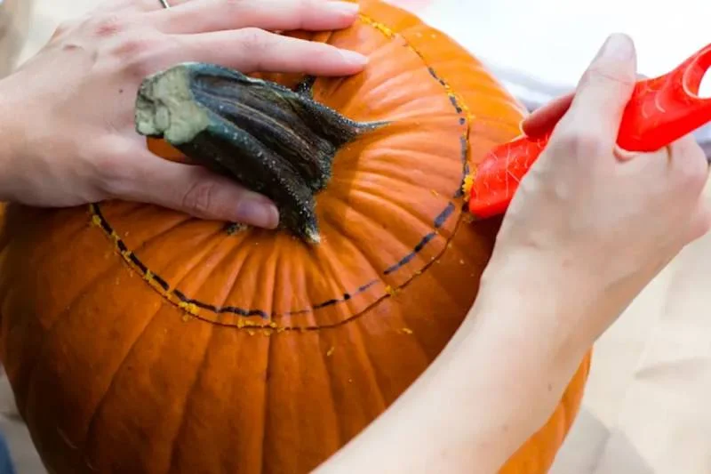 - Tracez votre couvercle : Délimitez un couvercle circulaire autour de la tige de citrouille, environ 5 à 6 pouces de diamètre ça devrait suffire amplement. Ajoutez une encoche à l'arrière si vous le souhaitez - ça facilite l'alignement quand vous replacez le couvercle plus tard donc c'est pratique.