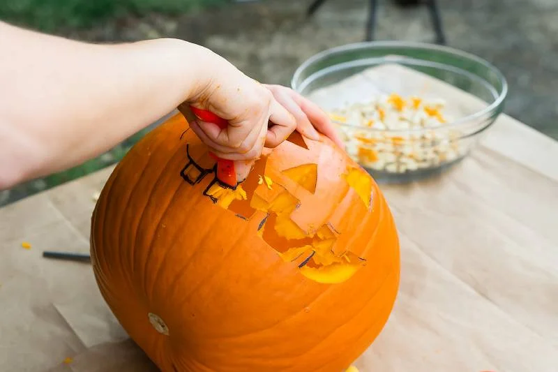 - Découpez le design : Faites des coupes droites dans votre citrouille le long des lignes de votre design précis, en retirant les morceaux un par un et en les jetant dans le bol de déchets prévu à cet effet spécifiquement.