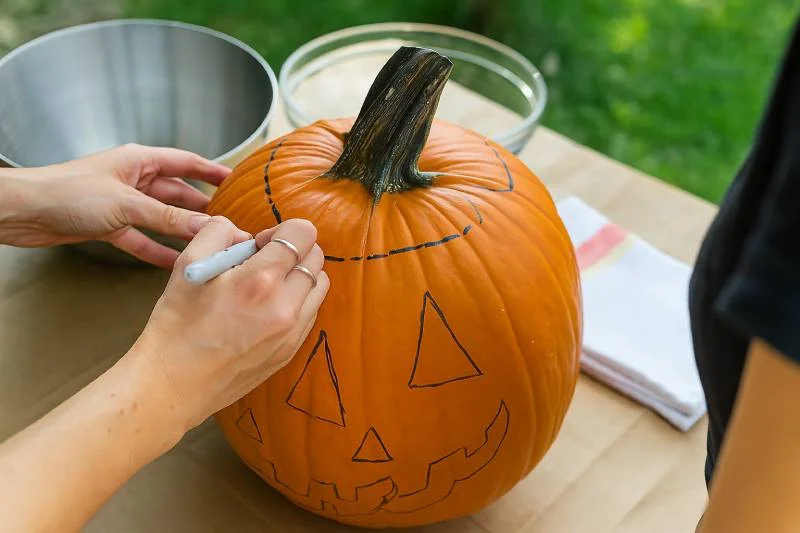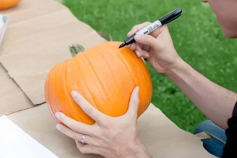 - Dessinez votre design : Après avoir déterminé le meilleur côté de votre citrouille pour un visage effrayant, utilisez le marqueur permanent pour esquisser des yeux. Un nez aussi, et un sourire denté qui fait peur aux gens.