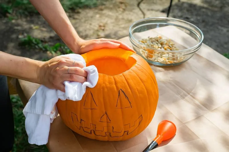 - Essuyez la citrouille : Utilisez le torchon de cuisine pour essuyer l'extérieur de la citrouille complètement. Afin qu'elle soit plus facile et plus sûre à sculpter sans glisser partout dangereusement.