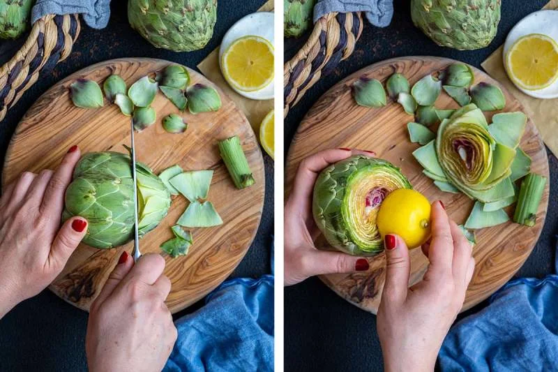 - Préparez vos artichauts normalement : tige coupée, feuilles extérieures retirées, citron frotté sur les parties coupées