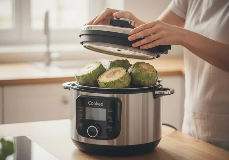Note complémentaire : Vous pouvez cuire 2 à 3 artichauts simultanément dans un Cookeo standard selon leur taille. Pour en cuire davantage, faites deux fournées plutôt que de les empiler — une couche unique garantit une cuisson uniforme et des résultats constants à chaque fois.