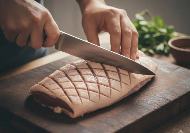 Le quadrillage de la peau est une étape cruciale qui ne doit surtout pas être négligée. Cette technique permet à la graisse de fondre uniformément pendant la cuisson, rendant ainsi la peau incroyablement croustillante. Prenez un couteau bien aiguisé et tracez des lignes diagonales espacées d'environ 1 cm, puis croisez-les dans l'autre sens pour former des losanges.