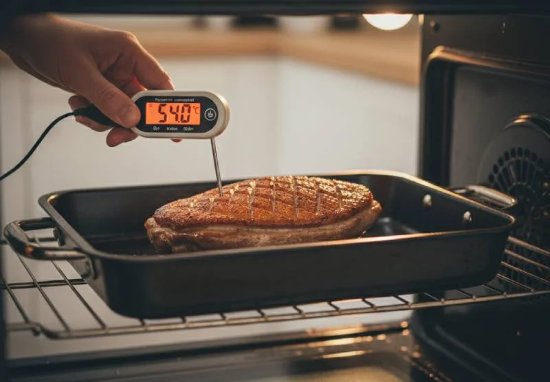 Il existe plusieurs techniques pour vérifier si votre magret est parfaitement cuit. La plus fiable, c'est évidemment le thermomètre à viande : piquez-le au cœur du magret, la température idéale pour une cuisson rosée se situe entre 52 et 56°C.