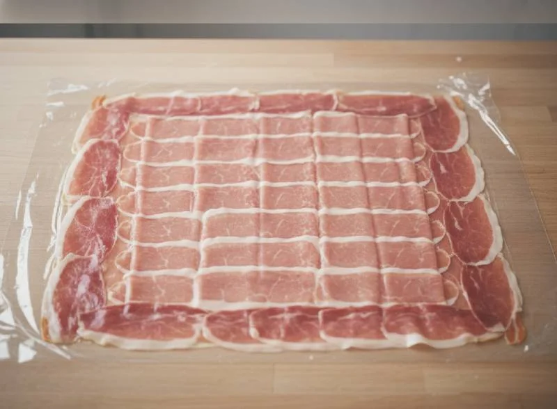 - Préparer le tapis de prosciutto : sur un grand morceau de film plastique (environ 40x40cm), disposez les tranches de prosciutto en les faisant légèrement se chevaucher pour créer un rectangle sans trous. Ce tapis doit être assez large pour envelopper complètement le filet. La disposition en quinconce garantit l'absence de fuites.