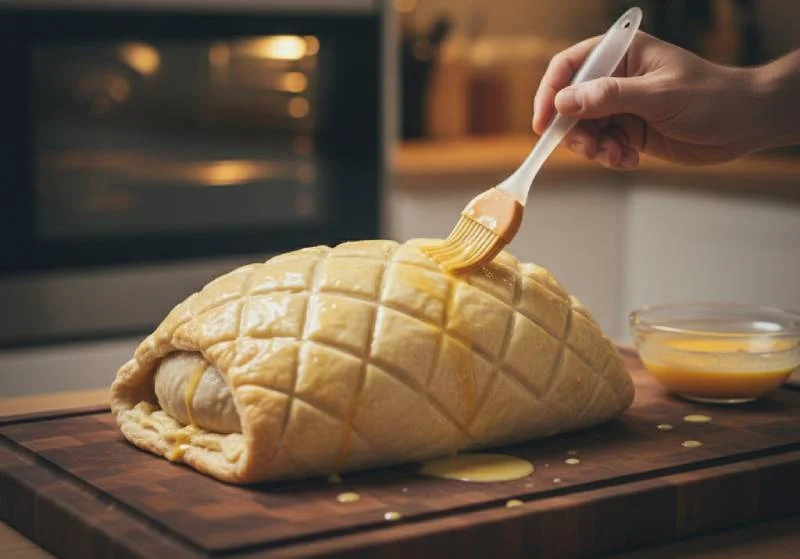 Avant d'enfourner, utilisez la pointe d'un couteau pour tracer délicatement des motifs décoratifs sur la pâte (chevrons, lignes diagonales, écailles de poisson) - ces rainures superficielles créent un effet visuel spectaculaire une fois dorées. Percez également 2-3 petites cheminées sur le dessus avec une brochette : ces ouvertures permettent à la vapeur de s'échapper pendant la cuisson, évitant que la pâte ne devienne détrempée de l'intérieur.