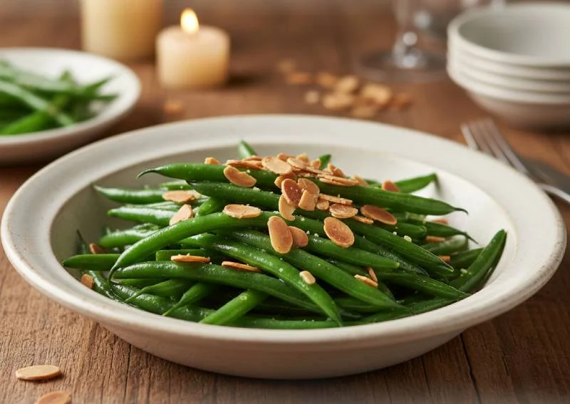La fraîcheur croquante des haricots verts coupe parfaitement la richesse du plat principal. Blanchissez 600g de haricots verts extra-fins 4 minutes dans l'eau bouillante salée, refroidissez-les immédiatement dans l'eau glacée (blanchiment) pour fixer leur couleur verte éclatante. Au moment de servir, faites-les sauter 2 minutes dans du beurre avec 50g d'amandes effilées préalablement grillées à sec et un filet de jus de citron.