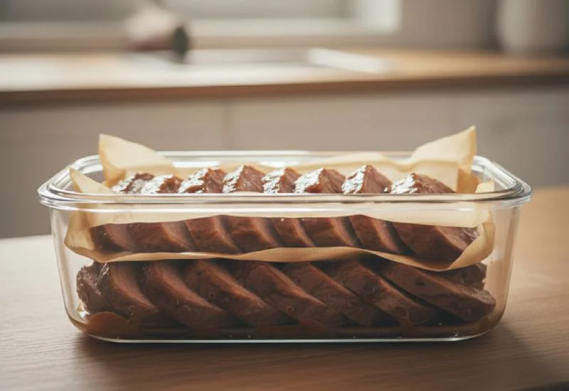 Disposez les tranches dans un contenant hermétique en les séparant par des feuilles de papier sulfurisé pour éviter qu'elles ne collent entre elles. Arrosez-les légèrement de sauce refroidie - cette couche protectrice empêchera l'oxydation et le dessèchement. Consommez dans les 3 jours maximum pour une qualité optimale.