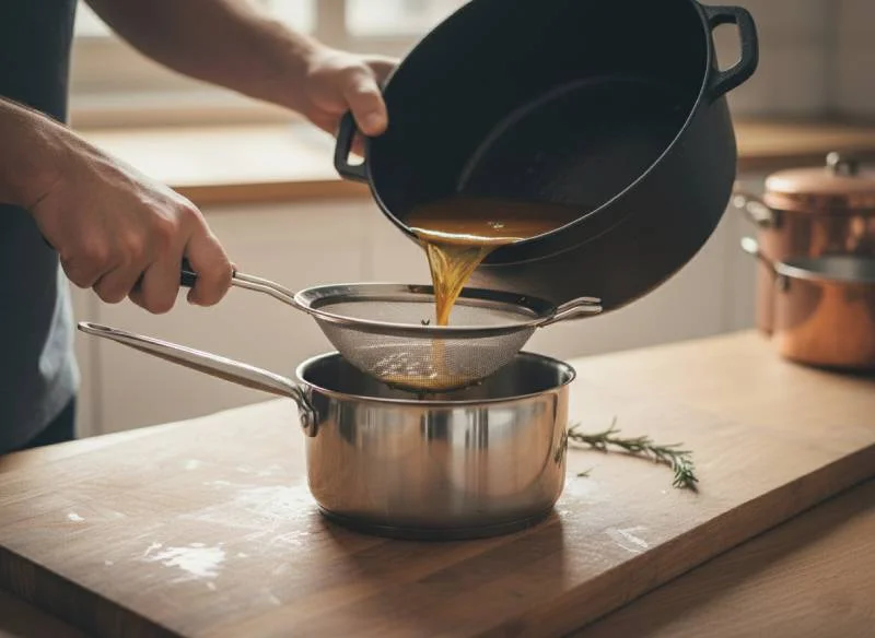 Durant cette réduction, écumez régulièrement la surface avec une petite louche pour retirer la mousse et les impuretés qui remontent. Une fois la consistance idéale atteinte, goûtez et rectifiez l'assaisonnement si nécessaire. Pour une sauce encore plus luxueuse, incorporez hors du feu une noix de beurre froid en fouettant vigoureusement - cette technique du "montage au beurre" donnera une brillance spectaculaire et une onctuosité irrésistible.