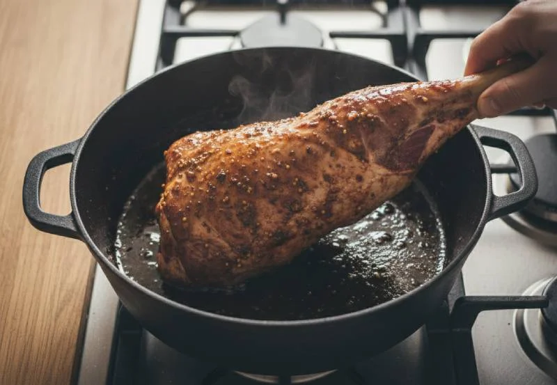 Avec deux spatules larges ou des pinces robustes (jamais de fourchette qui percerait la viande), retournez le gigot sur chaque face pour obtenir une coloration dorée uniforme. Cette opération devrait prendre 15 à 20 minutes au total. Les épices de la marinade vont brunir et créer cette croûte aromatique qui concentrera les saveurs.