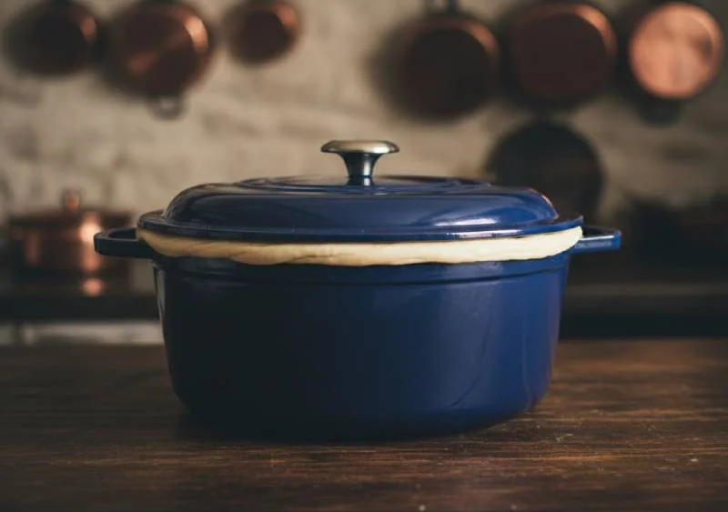 Si vous ne possédez pas de cocotte adaptée, utilisez un plat à rôtir profond en fonte ou en céramique épaisse, et créez un couvercle hermétique avec plusieurs couches de papier aluminium épais. Lutez ensuite le tout avec votre pâte comme vous le feriez avec un couvercle traditionnel. Le résultat sera presque aussi bon, même si une vraie cocotte en fonte reste l'idéal pour la diffusion uniforme de la chaleur.