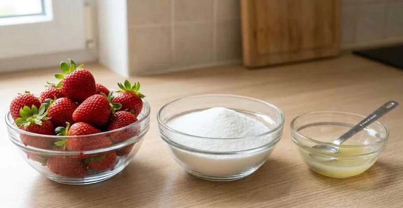 Une cuillère à café seulement — mais elle fait beaucoup. Le jus de citron active la pectine du sucre spécial confiture, aide à la prise, et surtout relève le goût des fraises en apportant une légère acidité qui équilibre la douceur du sucre. Sans lui, la confiture peut paraître un peu plate et trop sucrée.