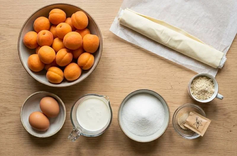 Voici la recette complète pour 6 personnes. La préparation active prend moins de 20 minutes — c'est l'un des atouts majeurs de cette tarte. La cuisson se déroule en deux temps : 10 minutes seule pour précuire légèrement la pâte et les abricots, puis 20 minutes avec l'appareil à la crème d'amande. Comptez encore 5 minutes de repos four éteint et 30 minutes de refroidissement sur grille pour une tarte parfaitement démoulable.