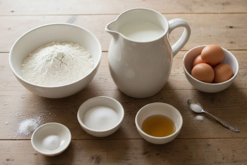 Cette recette est calibrée pour produire environ 15 à 18 crêpes selon l'épaisseur et le diamètre de votre poêle — soit une portion généreuse pour 5 personnes. Les ingrédients sont simples, probablement déjà dans votre cuisine, et aucun ne nécessite un déplacement spécial en épicerie fine.
