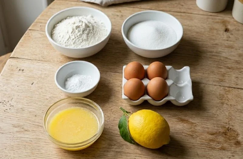 Un cake au citron réussi commence par des ingrédients bien choisis. La recette est courte — six ingrédients seulement pour 7 personnes — et chacun d'eux joue un rôle précis dans la texture et le goût final. Il n'y a pas de place pour les compromis.
